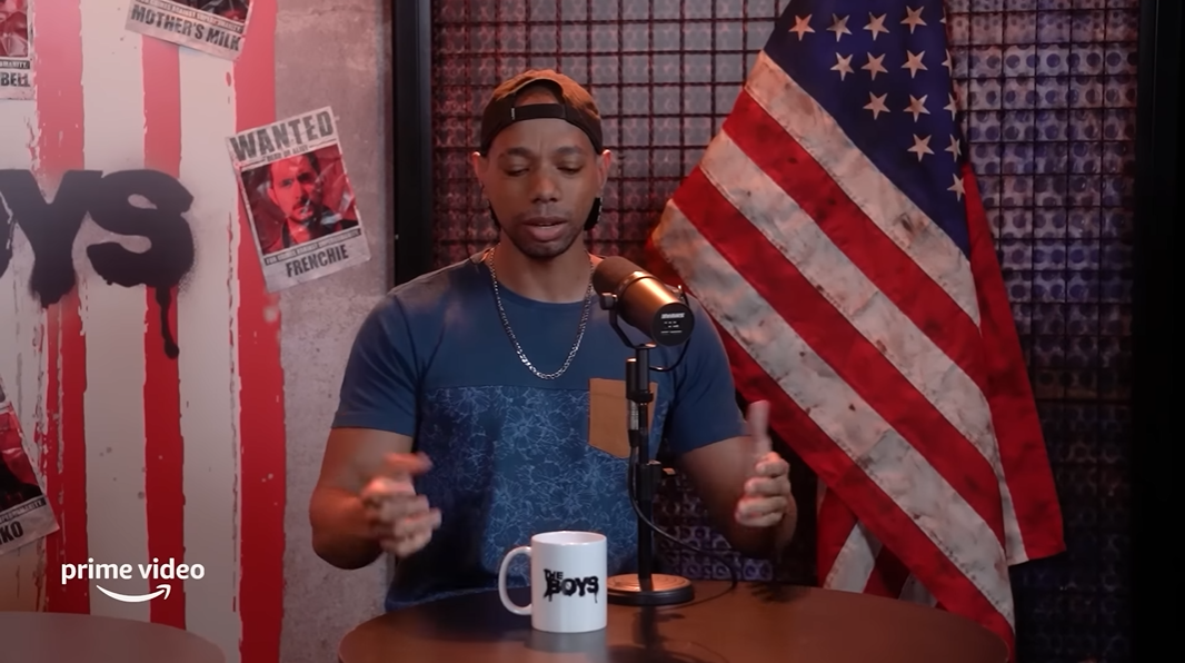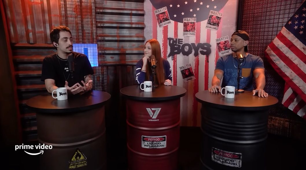 Projeto realizado para o videocast especial temático de The Boys, para o canal de YouTube do Prime Video Brasil. A proposta consistiu em um cenário que remetesse a um espaço industrial, como um bunker, trazendo referências da série, através de texturas metálicas enferrujadas e cores escuras. Além disso, o stencil que é bastante presente na identidade visual gráfica da série. Considerando um espaço para 3 influenciadores, sugerimos um espaço "avulso" para cada um dos 3, sendo um tonel e uma banqueta alta para cada, remetendo a um espaço mais informal de conversa.